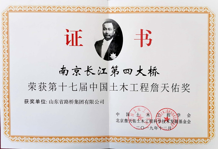 9月22日,在中国土木工程学会2020年学术年会暨第十七届中国土木工程詹天佑奖颁奖大会上,山东九游会官方网站参建的南京长江第四大桥喜获詹天佑奖,这是山东九游会官方网站第二次获此殊荣。