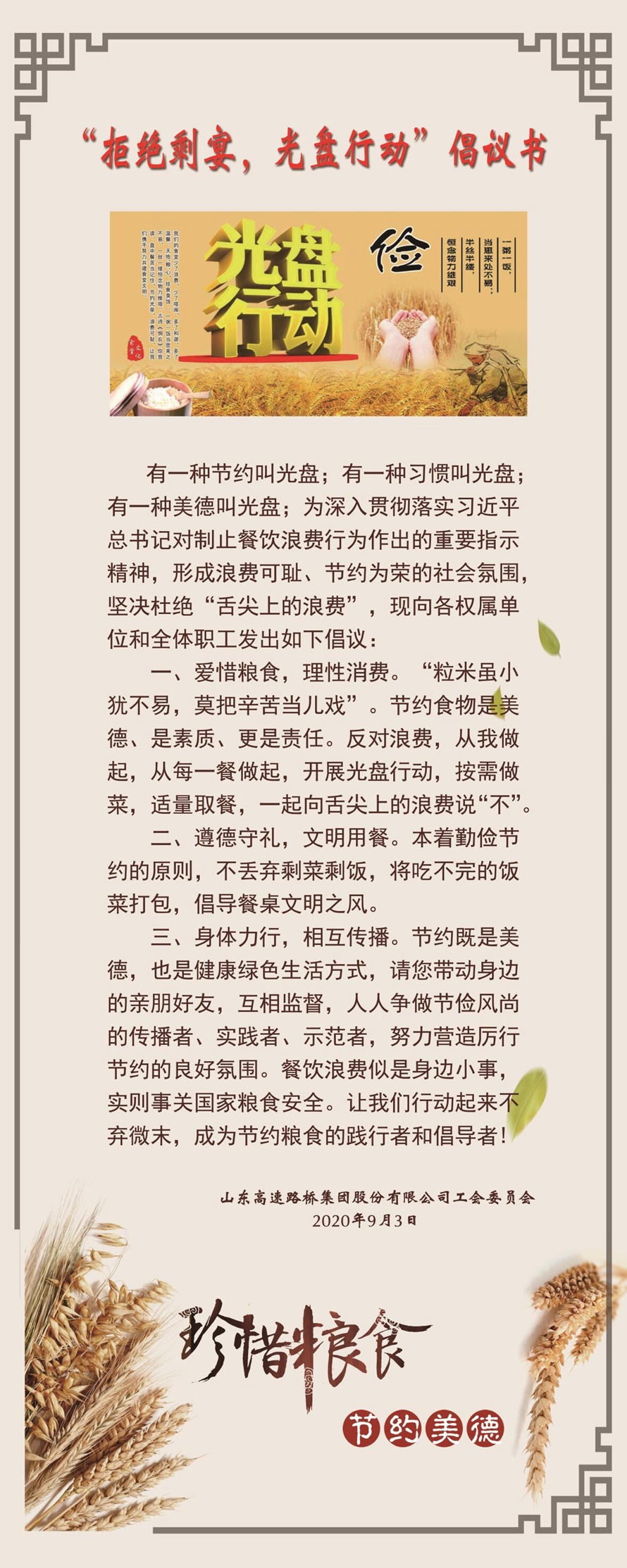 为贯彻落实习近平总书记制止餐饮浪费的指示精神,九游会官方网站股份全体职工誓将“厉行勤俭节约,反对铺张浪费”的倡议深入开展。